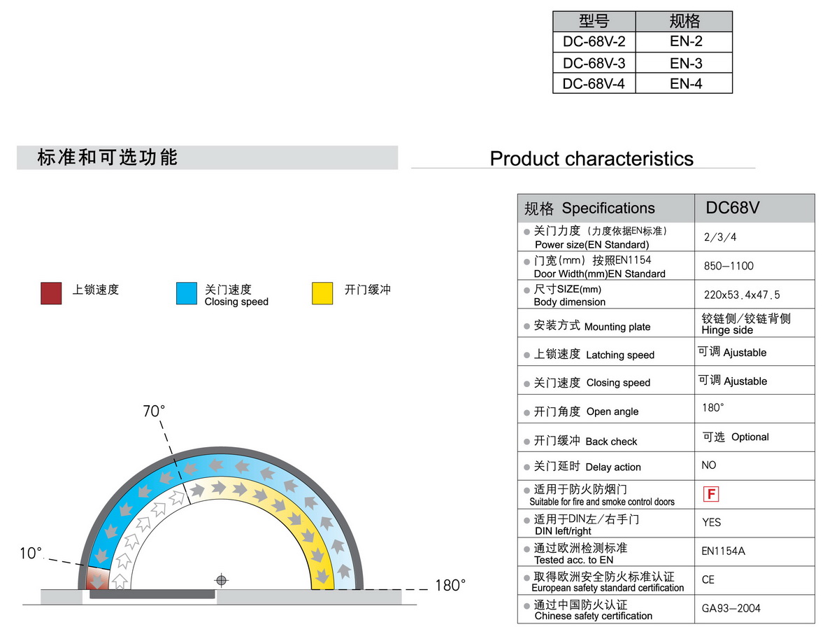 其中2、3、4表明DC68V能滿足這(zhè)個三個關門力度。而不同力等級與門重之(zhī)間大致的對應關(guān)係為:2級力相當於承重45KG左右、3級力相當於60KG左右(yòu)、4級力80KG力左右、5級力相當於承重100KG左右。一般5級力(lì)就能滿足絕大部分需求,所以大部分閉門器最(zuì)多隻(zhī)到5級力。更重的門通常會選擇地彈簧的解決方(fāng)案。因為5級(jí)力以上的大型(xíng)閉門器價格都比(bǐ)較貴,而同樣承重(chóng)的地彈(dàn)簧反而價格要便宜不少。